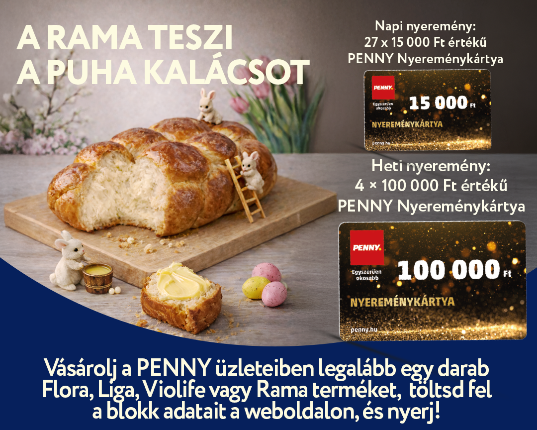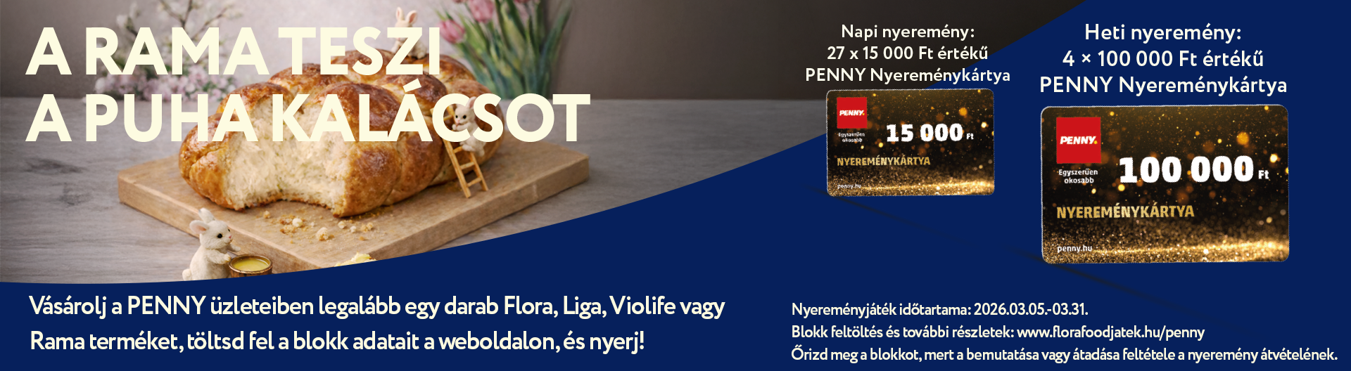 Vásárolj a PENNY Market Kft. magyarországi üzleteiben, vagy a Foodora online webshopján keresztül legalább egy darab a promócióban részt vevő Flora, Liga, Violife, Rama, vagy Rama Cremefine spray terméket* 2026. március 5. és 2026. március 31. között, és a Tied lehet a napi 1 db 15.000 Ft értékű Penny nyereménykártya, vagy a heti 1 db 100.000 Ft értékű Penny nyereménykártya egyike.